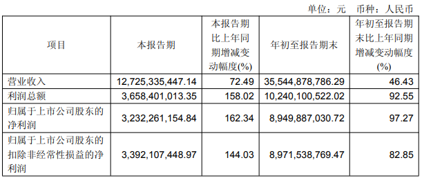 中国经济网北京10月28日电 据暴丰能源(600989.SH)近日发布的2025年三季报显示,公司前三季度实现营业利润355.45亿元,同比增长46.43%。归属于上市公司股东的净利润89.5亿元。 ,比上年增长97.27%。归属于上市公司股东的扣除非经常性损益的净利润89.72亿元,比上年同期增长82.85%。经营活动产生的现金流量净额135.82亿元,比上年同期增长135.00%。截至2025年9月30日,宝丰能源总资产902.86亿元,负债总额443.31亿元。据此计算,资产负债率为49.10%。截至2025年9月30日,宝丰能源一年内到期的固定债务为64,490亿元,长期借款为206.43亿元。以此计算,有息债务总额为270.92亿元。根据暴丰能源2025年7月6日披露的股权质押公告,截至公告日,公司第一大股东宁夏暴丰集团有限公司(以下简称“暴丰集团”)拥有2,614,211,270股,持股比例为35.65%。公司共有7亿股股份被质押,占公司股份的26.78%,占公司总股本的9.55%。暴风集团及其子公司东易国际合计持有股份4,614,211,270股,持股比例为62.92%。公司股份共计9.5亿股被质押,占公司股份20.59%,占公司总股本12.95%。
