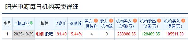 阳光电源涨15.44%,机构投资者净赚10.55亿元。