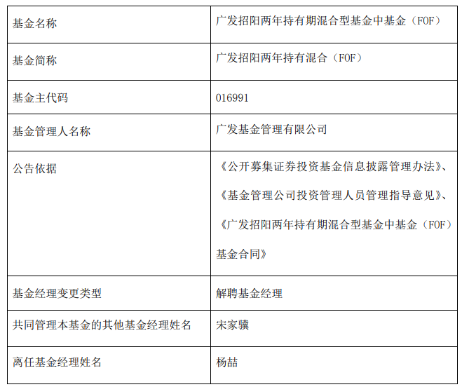 杨喆先生辞去广发昭阳股份有限公司职务,担任联合母基金两年,由宋家吉先生监事。